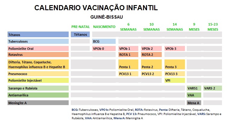 O calendário de vacinação aplicado na Guiné Bissau é o seguinte: